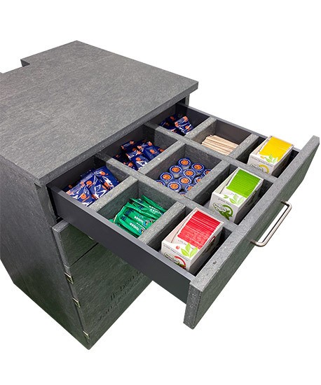 Ons Close Future koffiemeubel is niet alleen erg bijzonder, maar ook nog eens heel praktisch. Dit koffiemeubel kan gebruikt worden voor alle tabletop koffiemachines uit ons assortiment en is voorzien van twee bekerhouders voor in totaal 150 bekers. Daarnaast heeft dit meubel een kastruimte voor het opbergen van voorraad. En een ruime lade voor bijvoorbeeld thee, suiker, melk of koekjes. Het opbergsysteem in de lade zorgt voor een handige indeling. Hierdoor zijn alle producten voor in en om de koffie netjes opgeborgen en blijft de koffiehoek opgeruimd en schoon.