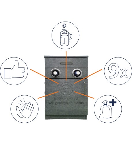 Het Close Future koffiemeubel kan door de unieke samenstelling perfect worden gerecycled. Na gebruik wordt het plastic van het koffiemeubel opnieuw gevormd tot plaatmateriaal waar vervolgens weer een kast van gemaakt kan worden. Het plasticmateriaal van ons Close Future koffiemeubel kan tot 9 keer worden hergebruikt. Dat is pas echt duurzaam!