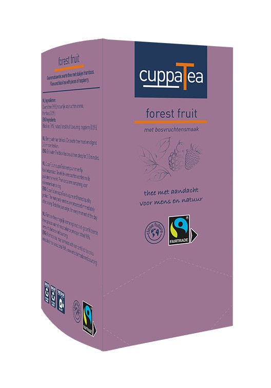 Fruitige zwarte thee met echte stukjes gedroogde framboos en een rijk aroma van heerlijke bosvruchten. Fris, fruitig met een licht zuurtje. Ook zomers te gebruiken als basis voor koude ice tea.
