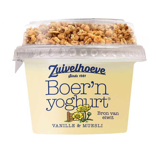 Een heerlijke stevige Boer'n yoghurt met de smaak van frisse vanille en een heerlijke krokante muesli in de topcup.
