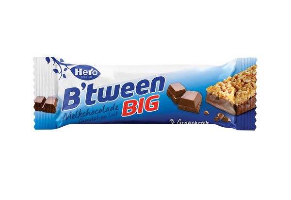 Hero B'tween Melkchocolade is een granenreep van verschillende granen en heerlijke melkchocolade er tussendoor.